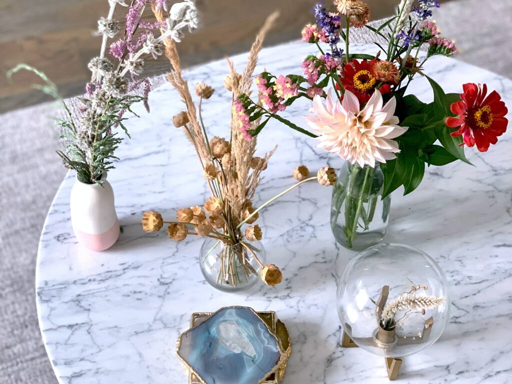 If you’re asking yourself ‘WTH*CK’ is a moss topiary, we’ve included an example below. These are a little different than your typical greenery and floral arrangement. They have a fuzzy look to them that creates a unique and fun display for your guests to take in. Green tends to contrast well with a glass coffee table whereas florals contrast well with wood and metal coffee tables.